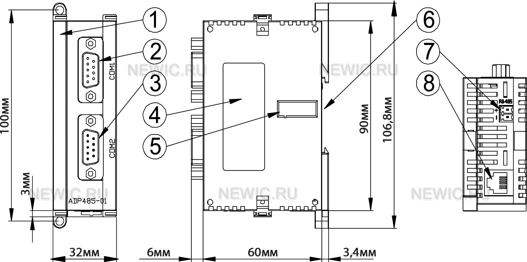 5. Переключатель резисторов смещения (ВКЛ/ВЫКЛ) 6. Углубление для монтажа на DIN-рельс 7. Клемма RS485 8. Гнездо RJ12 |