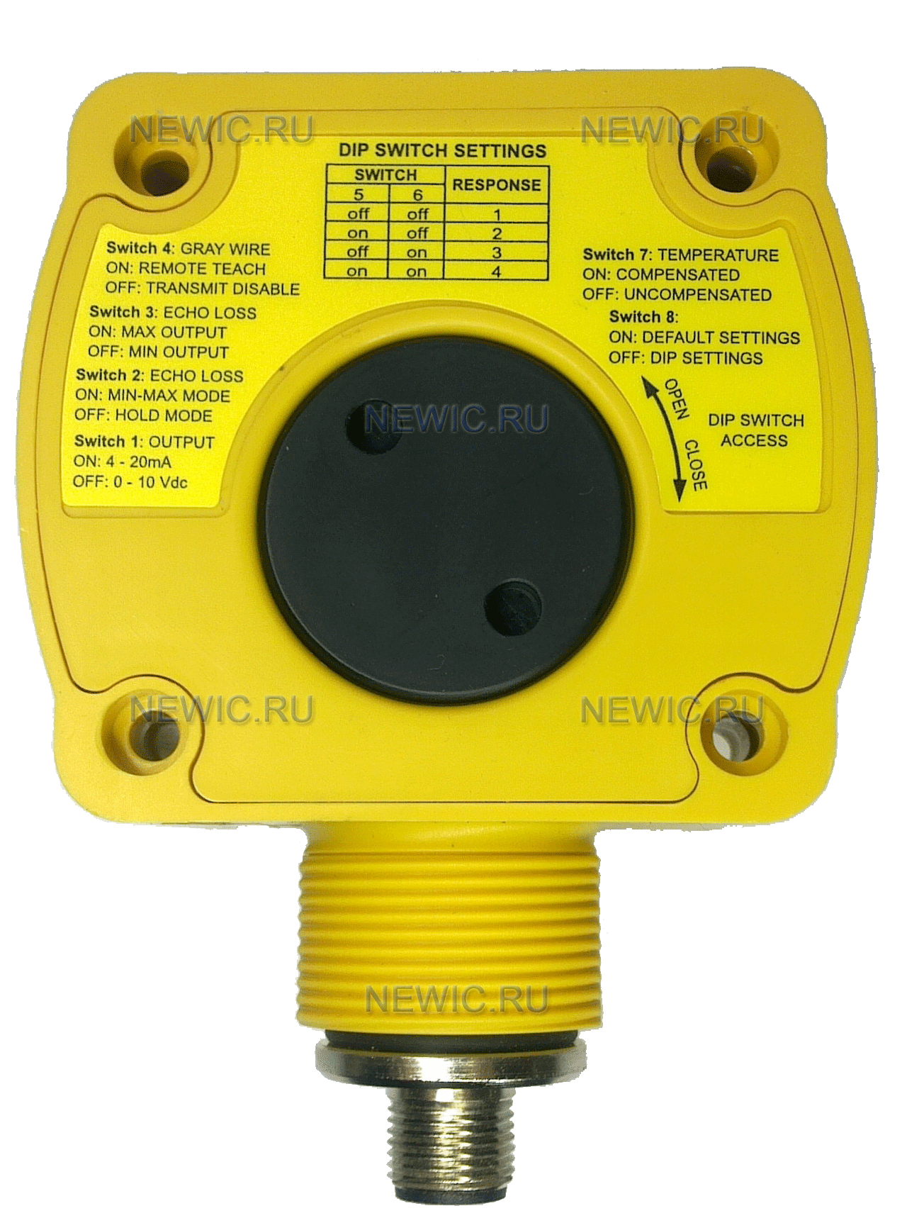 Изменения температуры воздуха влияют на скорость звука, которая, в свою очередь, влияет на расстояние, считываемое датчиком. Увеличение температуры воздуха сдвигает оба предела окна чувствительности ближе к датчику. И наоборот, уменьшение температуры воздуха сдвигает оба предела дальше от датчика. Этот сдвиг составляет приблизительно 3,5% от расстояния предела на изменение температуры в 20°C. С включенной температурной компенсацией (Переключатель 7 ON), датчик будет поддерживать пределы окна в рамках 1,8 процентов в диапазоне от -20°C до +70°C.